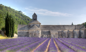 - Cadre naturel et sensoriel : Les champs de lavande qui s’étendent à perte de vue en avant-plan ajoutent une dimension sensorielle à l’expérience. La lavande, avec ses couleurs apaisantes et ses parfums envoûtants, offre un cadre idéal pour ralentir et s’immerger dans la nature. Le contraste entre les pierres grises de l’abbaye et le violet des lavandes capte l’œil et invite à la contemplation.
